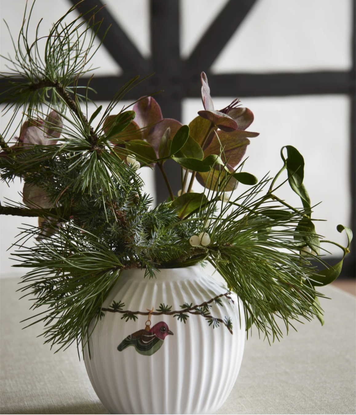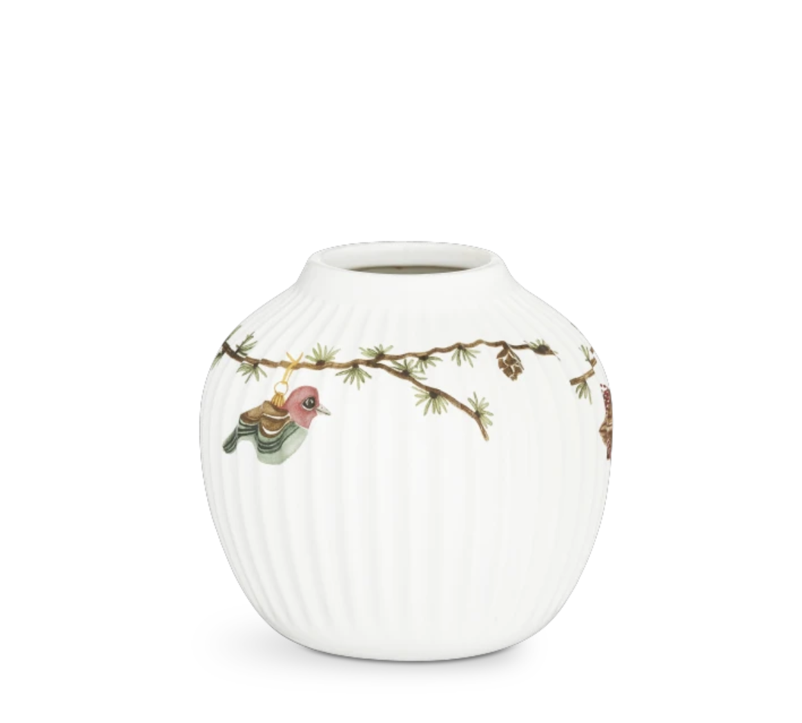 Hammershøi Christmas byder julen velkommen med en række nye illustrationer på udvalgte dele af det populære julestel. De fine, detaljerede julemotiver er skabt af kunstneren Rikke Jacobsen, som med sin karakteristiske streg fortæller små historier med bl.a. kræmmerhuse, engle, valnødder, fugle, kogler og stjerner. Brug den smukke Hammershøi Christmas-vase til blomster på julens borde eller som en fin juledekoration i sig selv. Fås også i en lidt mindre variant på 10,5 cm. Glæd dig også over Rikke Jacobsens nye illustrationer på bordfade, saucekander, skåle, krus og julekugler i Hammershøi Christimas-serien.