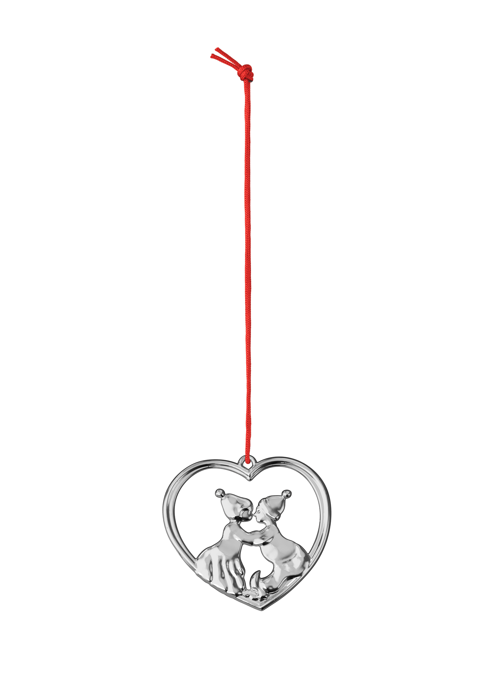 Klassisk julepynt med kunstnerisk kant. Rosendahls Karen Blixens Jul er for mange indbegrebet af den hyggelige og traditionelle jul – fuld af historie og julesymbolik, der får juleglæden til at holde helt indtil juleaften. Ole Kortzau lavede sin første Karen Blixen-julepynt tilbage i 2007. Og hvert år kommer der nye ophæng til i den særlige håndlavede kvalitet skabt med omhyggelighed og øje for detaljen i en sådan grad, at hvert enkelt ophæng fremstår som et lille kunstværk i sig selv, belagt med ægte sølv og guld. 2025-kollektionen indeholder blandt andet dette forsølvede hjerte med to kyssende nisser, der yndigt og svævende tilføjer den magi til december, der gør juletiden til noget helt særligt. Hjertet med de to kyssende nisser er et nærværende og kærligt julemotiv inspireret af de hjertevarme følelser, der dukker op hos mange af os i julen – et ikonisk symbol på julens hjertelighed og det kærlige samvær med vores kære i juletiden. Ophænget måler 6,5 cm i højden og fungerer både alene og sammen med de andre små ophæng i serien – perfekt som både vinduespynt og på juletræet. Motiverne i Karen Blixens Jul er ofte en kærlighedserklæring til børnenes perspektiv på julen. Men selvom Ole Kortzaus julehistorier tager udgangspunkt i virkeligheden, så er de ikke virkeligheden. Derfor er der også altid lige puffet lidt til motiverne. De er altid lidt skæve, lidt underfundige. Ole Kortzau vil have os til stoppe op, tage en pause – og nyde de særlige øjeblikke og opdage alle de klassiske karakterer på en anden måde. Dette juleophæng leveres med en fin rød snor.