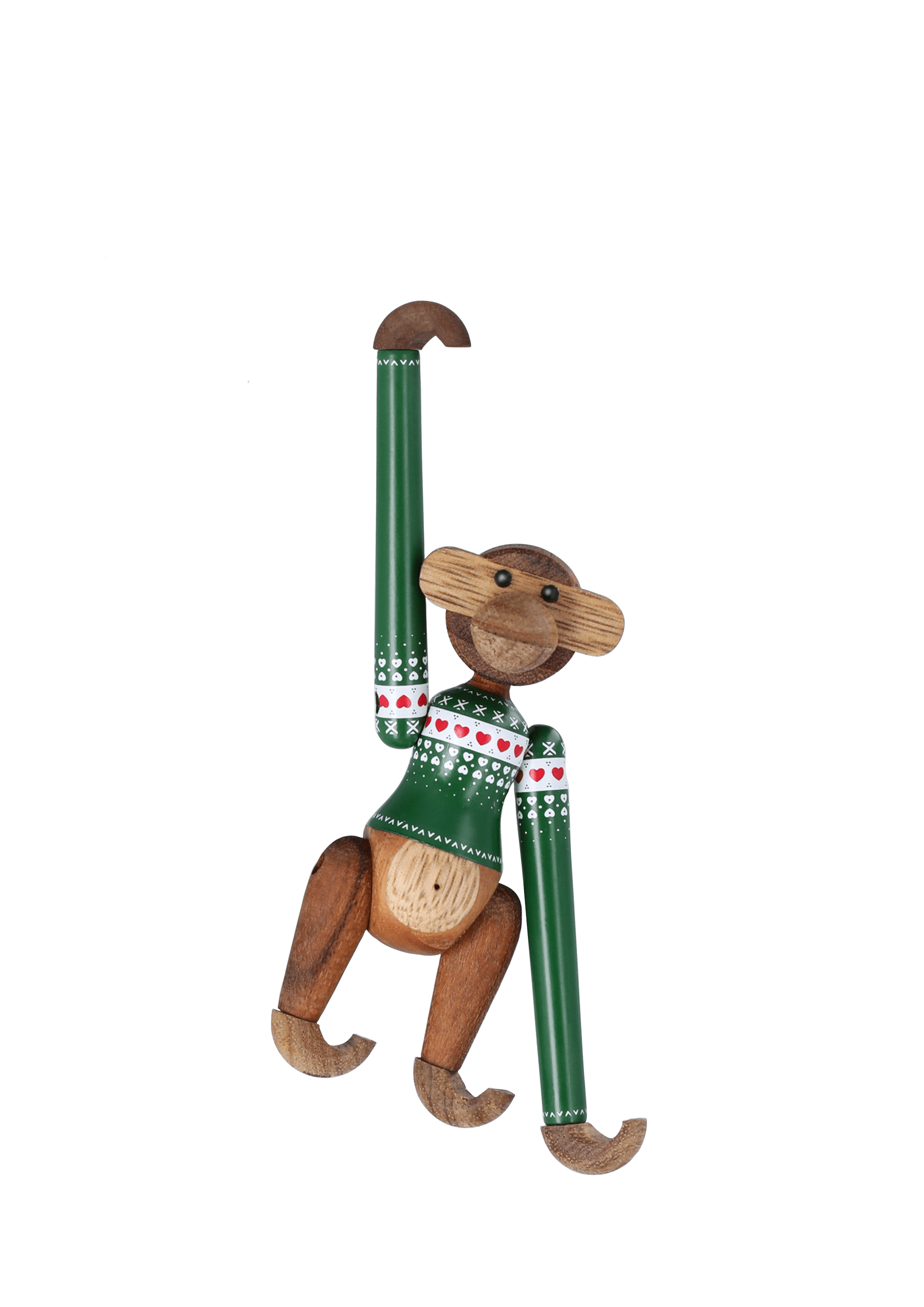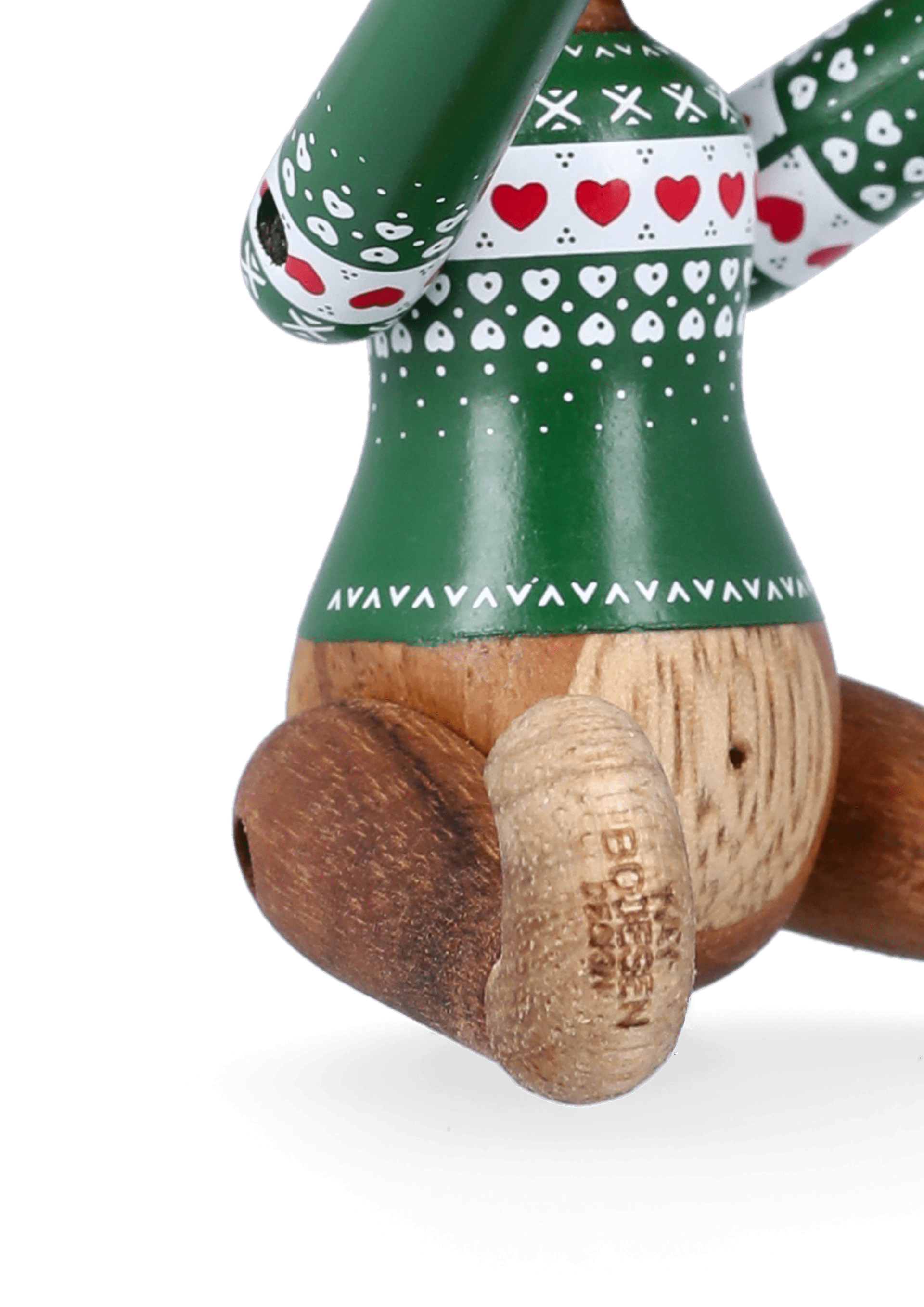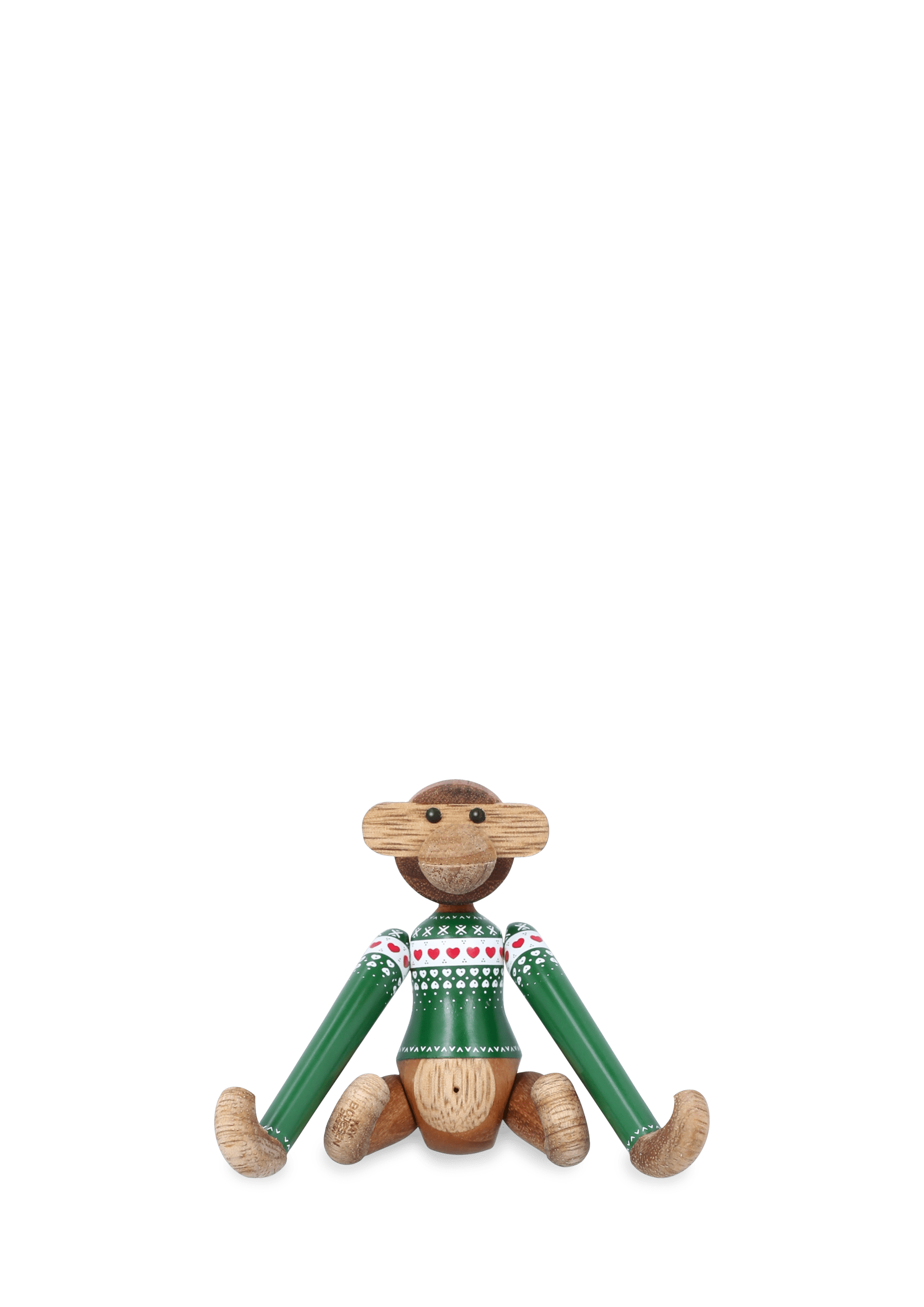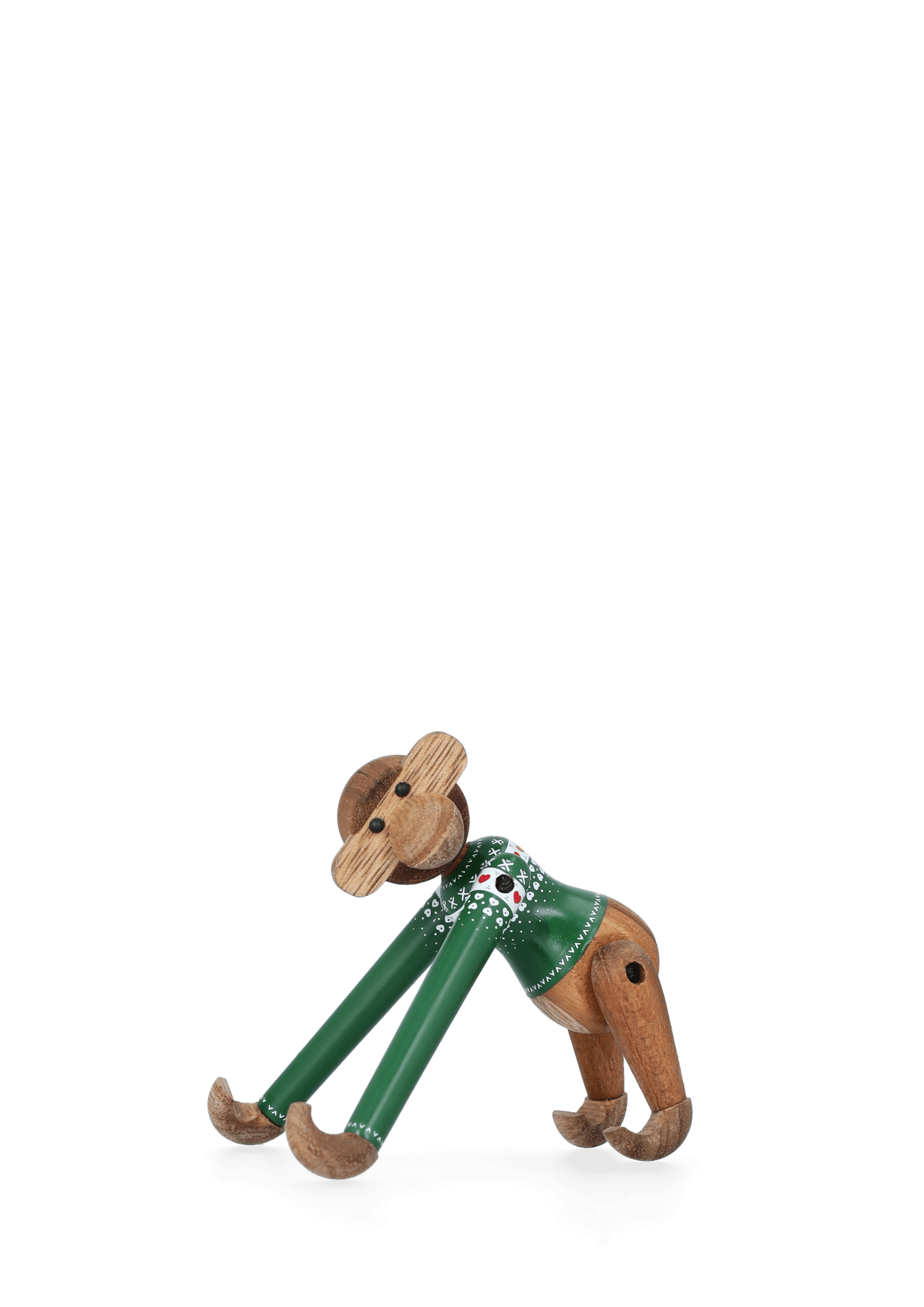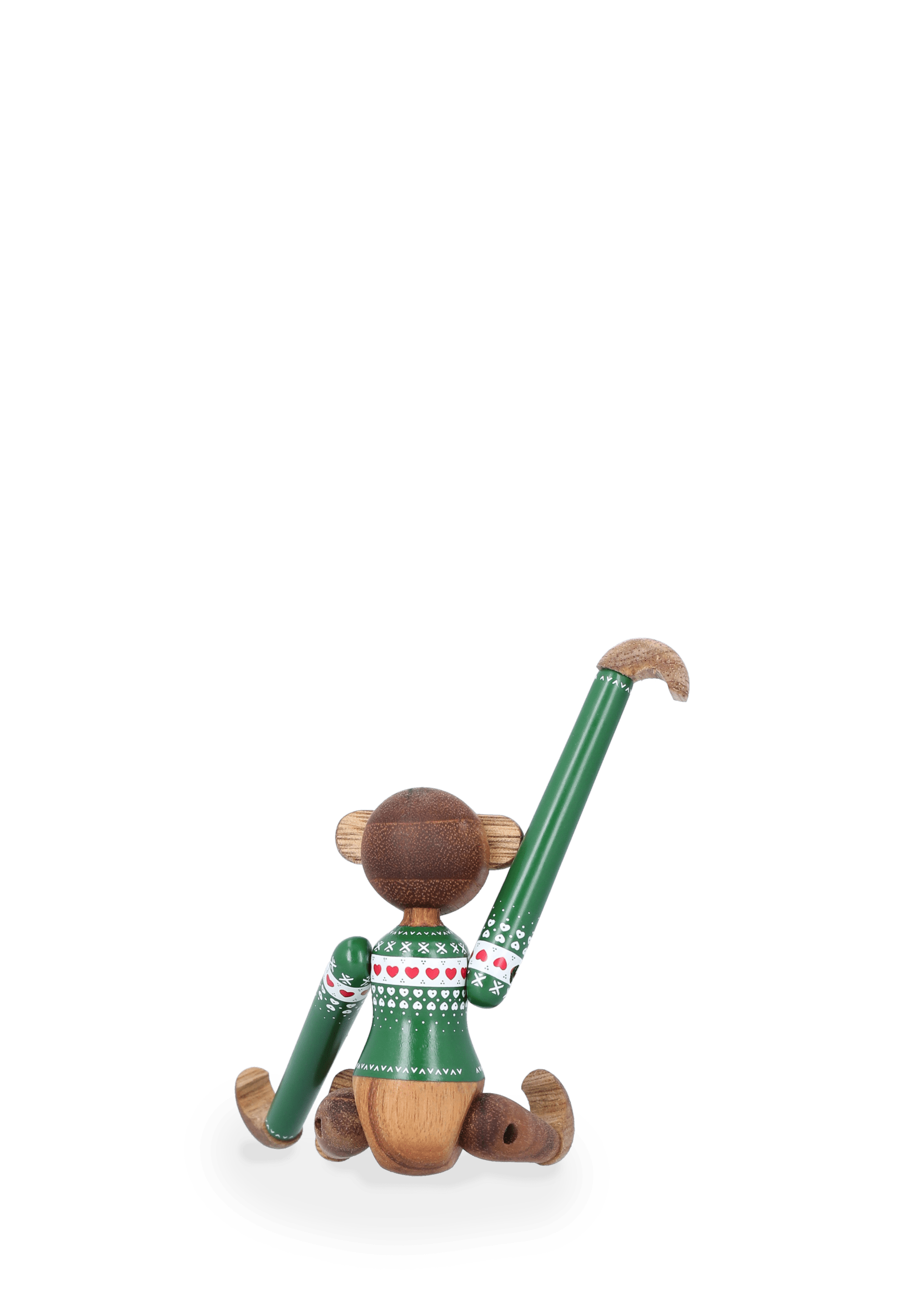 Original julemagi i et flot og moderne snit. Med den altid smilende Kay Bojesen Abe i en unik juleversion iført en flot grøn julesweater væves historien om Kay Bojesens alletiders verdensberømte designikon og vores hyggelige juletid endnu tættere sammen. Kay Bojesen Abe Julesweater 2025 er fremstillet i den velkendte smukt olierede komposition med FSC®-certificeret teak og kontrolleret limba og kommer i både denne miniversion på 9,5 cm og klassiske lille størrelse på 18,5 cm i højden. Begge prydes med et klassisk julemønster med de fineste julehjerter i både rød og hvid på bryst, mave og skuldre – og med en sød lille detalje med et smalt bånd med et dekorativt siksakmønster ved hver ærmekant og i bunden. Trøjens grønne bundfarve er malet med stor omhyggelighed, mens mønsteret i hvid og rød er påført med print med største præcision ned til de mindste detaljer, så julesweateren får det autentiske og gennemarbejdede udtryk fuld af den sjæl og humor, der altid har været udgangspunktet for Kay Bojesens unikke håndværk og historiefortælling. Brugen af de klassiske julefarver og et ikonisk julemønster gør aben selvskreven som et levende og legende element i en moderne indretning i julen, hvor den vil skabe smil og stil med sin finurlige fremtoning og sit farverige udseende – uanset hvor den flytter ind. Kay Bojesen Abe Julesweater 2025 er nostalgisk og nyskabende dansk design, der ydmygt og med et glimt i øjet bygger videre på Kay Bojesens ikoniske designarv og fuld af julesjov tilføjer et nyt kærligt kapitel til hans originale fortællinger i træ siden 1922.