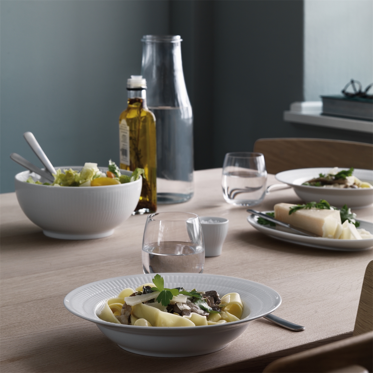 De håndlavede rifler stråler ud fra midten af denne dybe tallerken på 21 cm i Hvid Riflet og skaber et smukt mønster. Tallerkenens alsidige størrelse gør den til en evig favorit på ethvert spisebord. Hvid Riflet er skabt fra grundformen på Musselmalet Riflet og er et stel, der er minimalistisk, ubemalet og evigt klassisk. Stellets enkle, hvide overflade får hver steldel til at skille sig ud i håndlavet elegance, hvor de ikoniske rifler i porcelænet får lov at stråle. Hver steldel i Hvid Riflet er smuk i sig selv eller i kombination med et eller flere af Royal Copenhagens håndmalede stel.