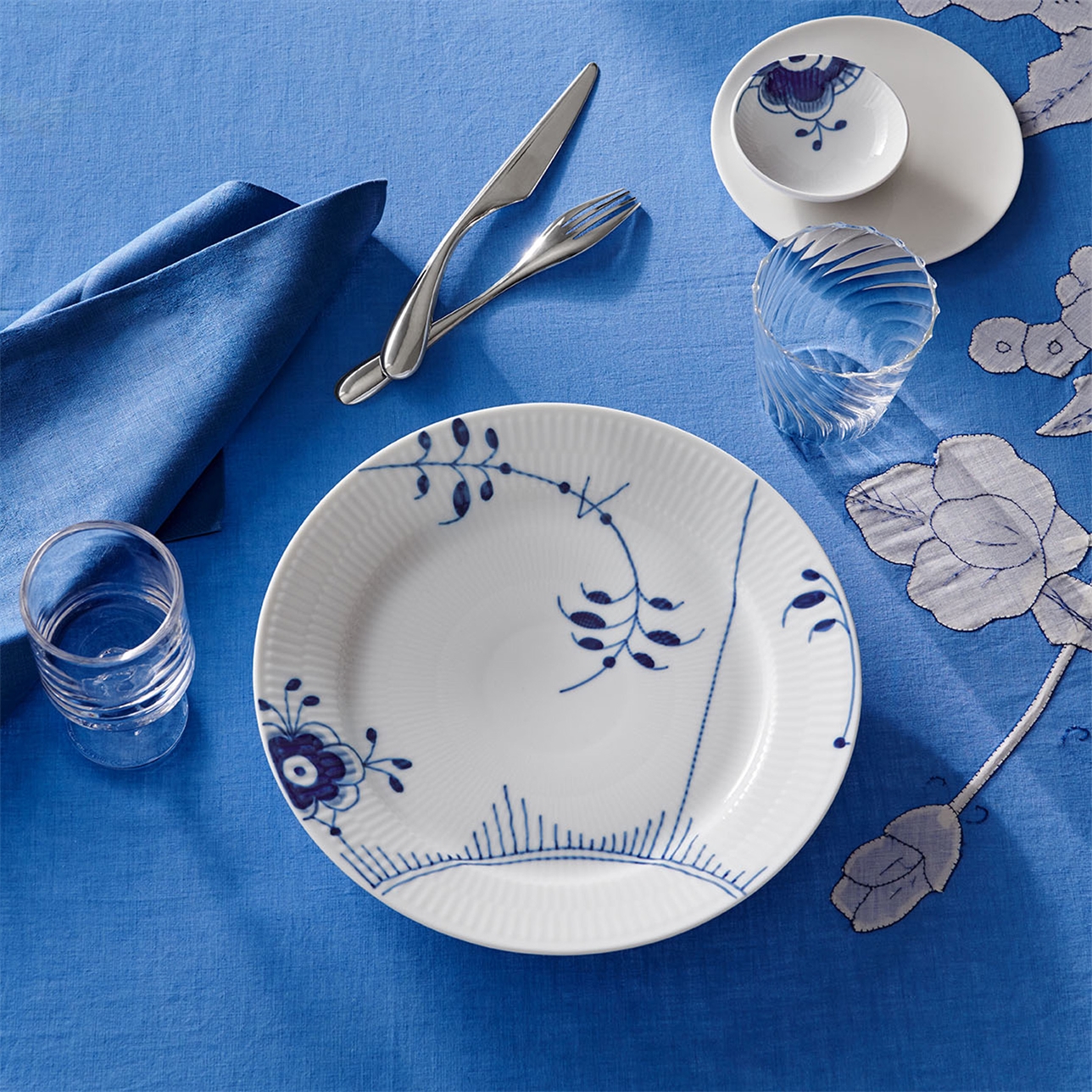Denne Blå Mega Riflet Tallerken på 27 cm er smuk både som middagstallerken og som serveringsfad. Den håndmalede tallerken i Blå Mega Riflet Dekoration Nr. 2 er centreret omkring en håndmalet palmette. Eksperimentér med din borddækning ved at kombinere tallerkenen med tallerkener i Blå Mega Riflet Dekoration Nr. 6 eller steldele fra andre Royal Copenhagen stel.