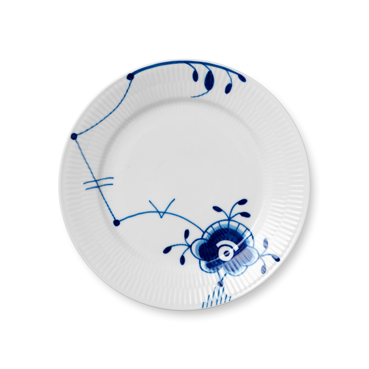 Blå Mega Riflet Dekoration Nr. 6 fra er håndmalet på denne tallerken på 22 cm, der er ideel som frokosttallerken og som en lille middagstallerken. Mønsteret med den stiliserede krysantemum kan med fordel kombineres med Blå Mega Riflet Dekoration Nr. 2 eller dele fra andre Royal Copenhagen stel for en personlig borddækning