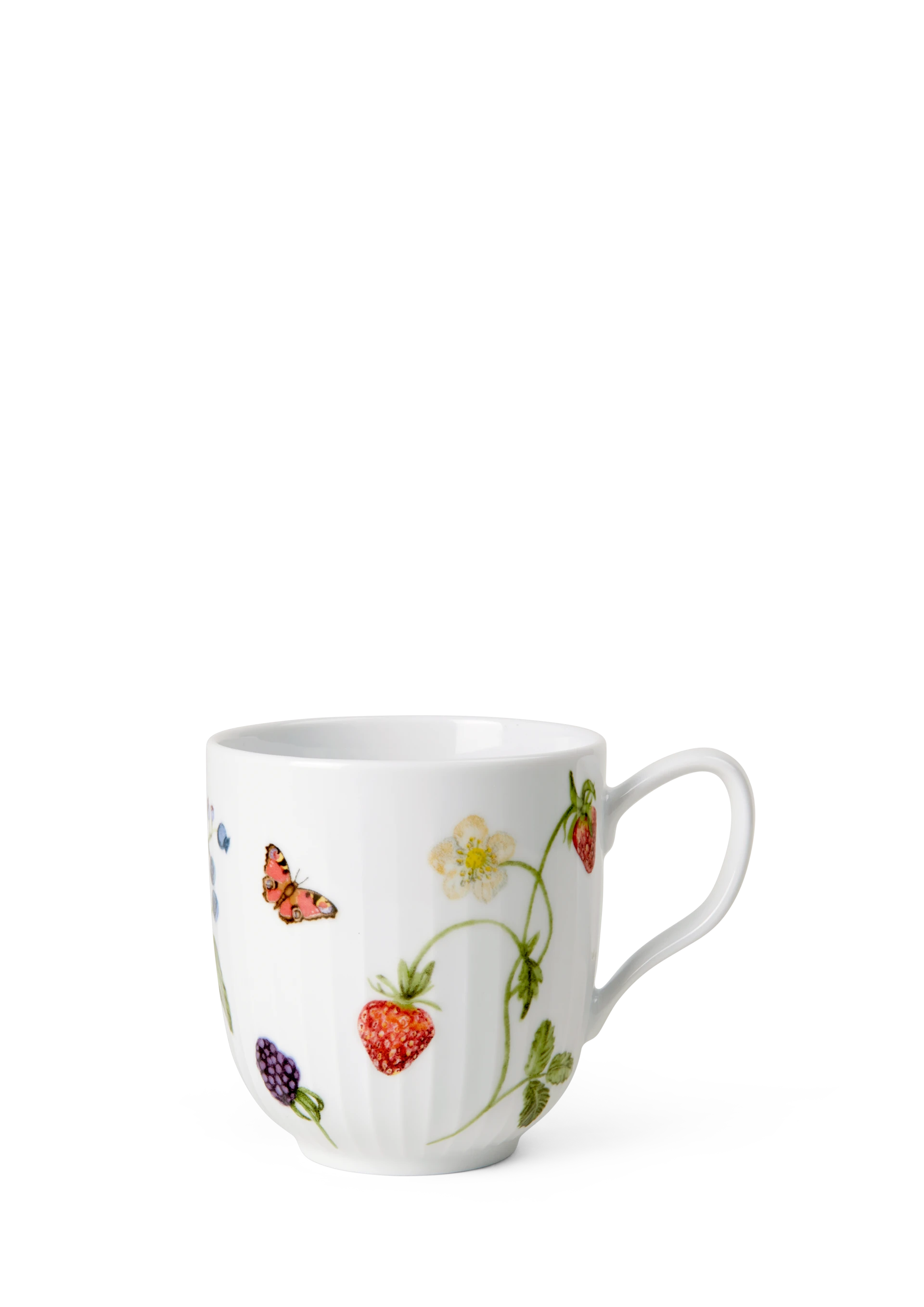 Hammershøi Summer-krus i hvidt porcelæn med motiv af bær og sommerfugl, der skaber en let og hyggelig sommerstemning.