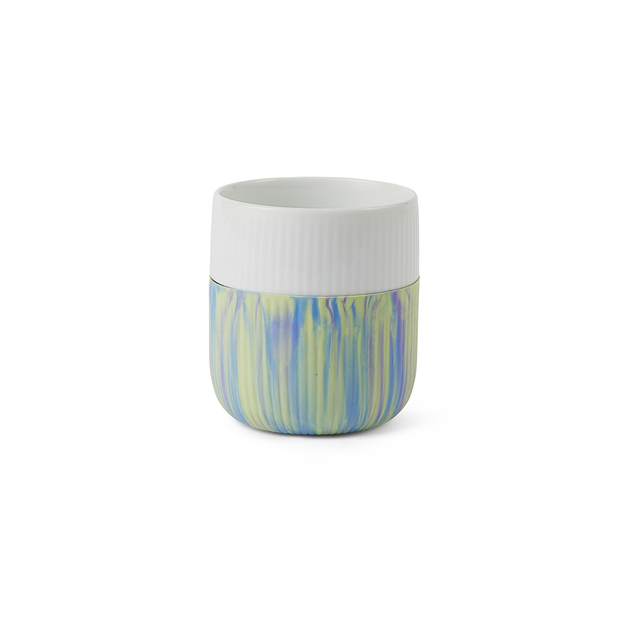 Riflet Contrast Marble kruset i farven nordlys har et unikt marmoreret mønster i grønne, lilla og blå nuancer inspireret af universets farvespil. De håndskårne rifler fortsætter elegant ned i den bløde silikonebund, som giver et godt og behageligt greb.