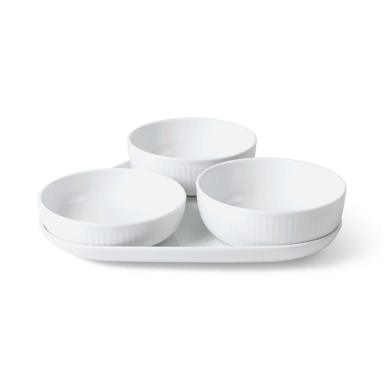 Hvid Riflet Serveringssættets minimalistiske udtryk understreger dets alsidighed. Sættet består af to større skåle, en mindre skål og en bakke, hvis trekantede form smukt indrammer de tre skåle. Hver del kan bruges for sig eller i samspil med de andre som et sæt, der er oplagt til både hverdag og særlige anledninger.