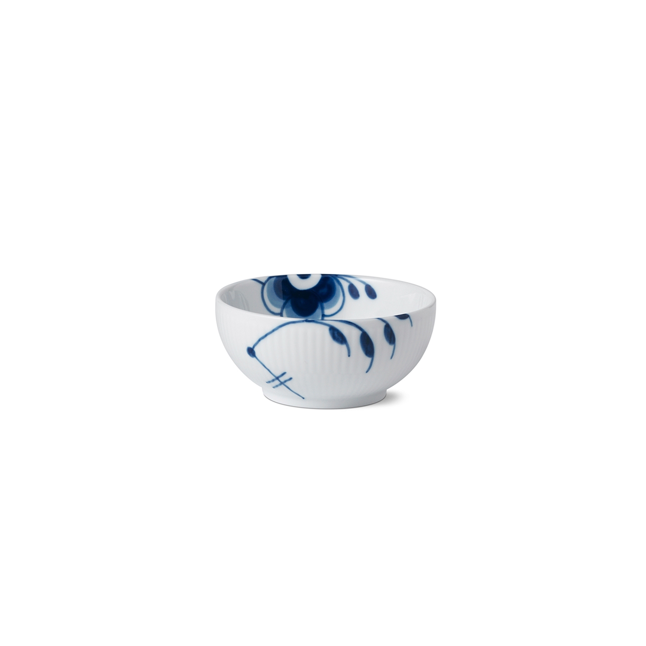 En håndmalet, forstørret nøddeblomst pryder skålens riflede ydre, mens en palmette dekorerer indersiden af denne skål på 24 cl i Blå Mega Riflet. Porcelænsskålen kan bruges til små serveringer af surt og sødt.