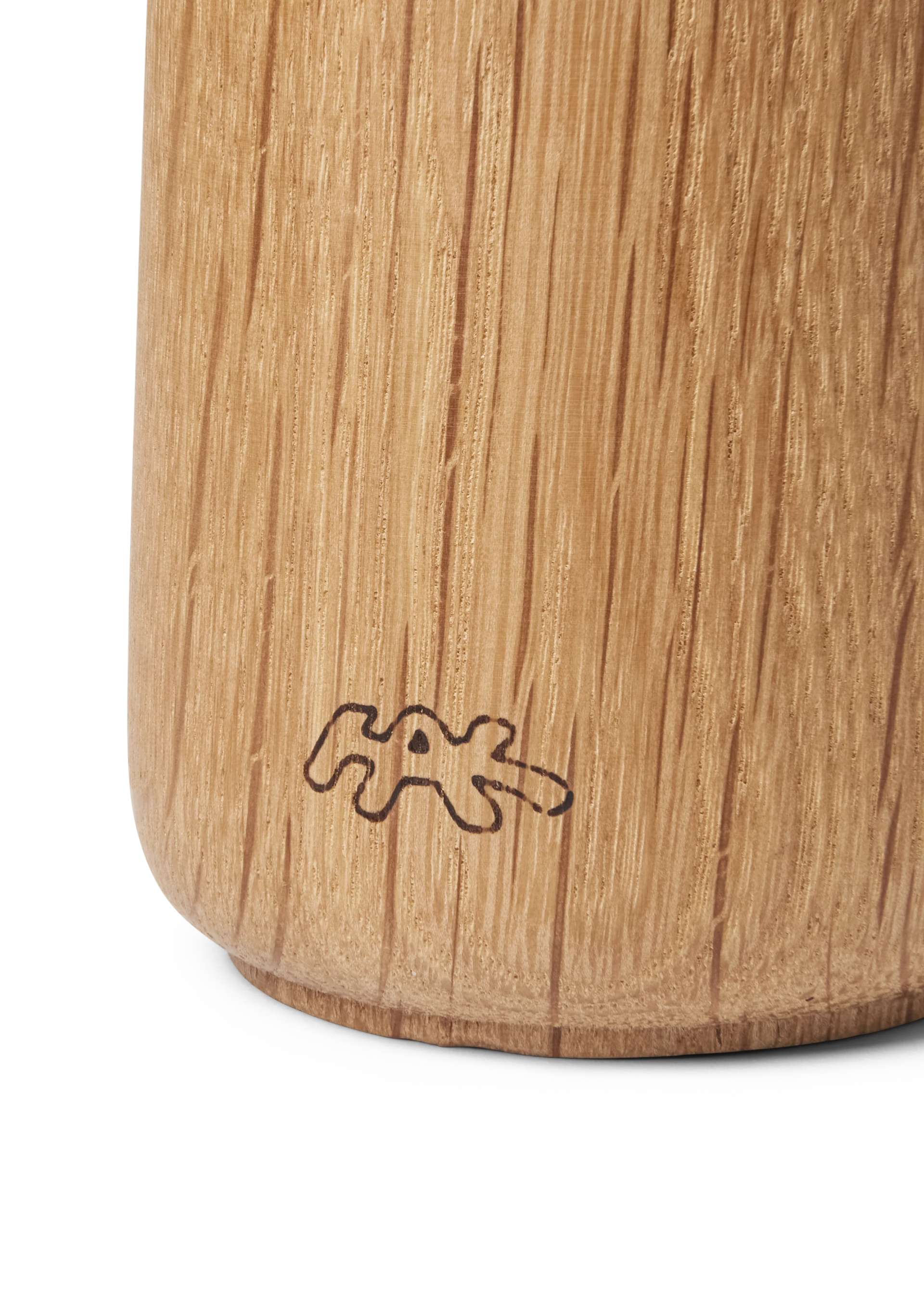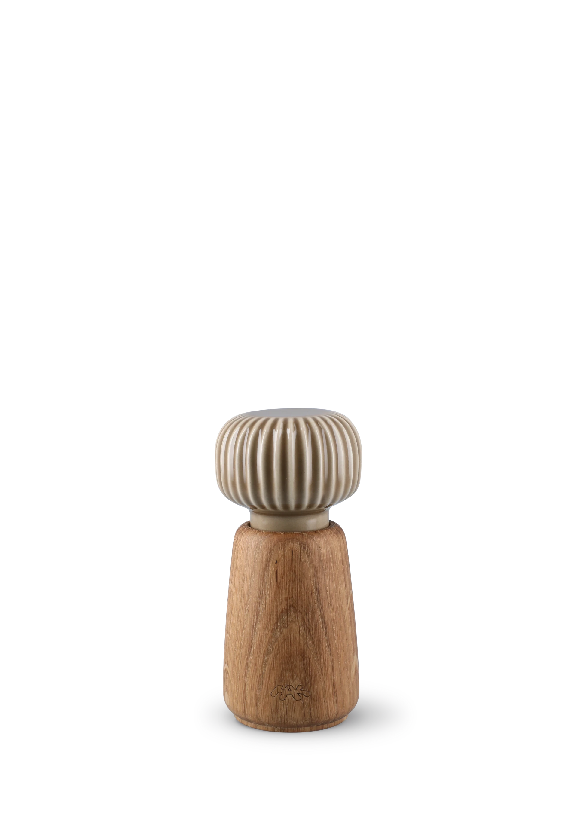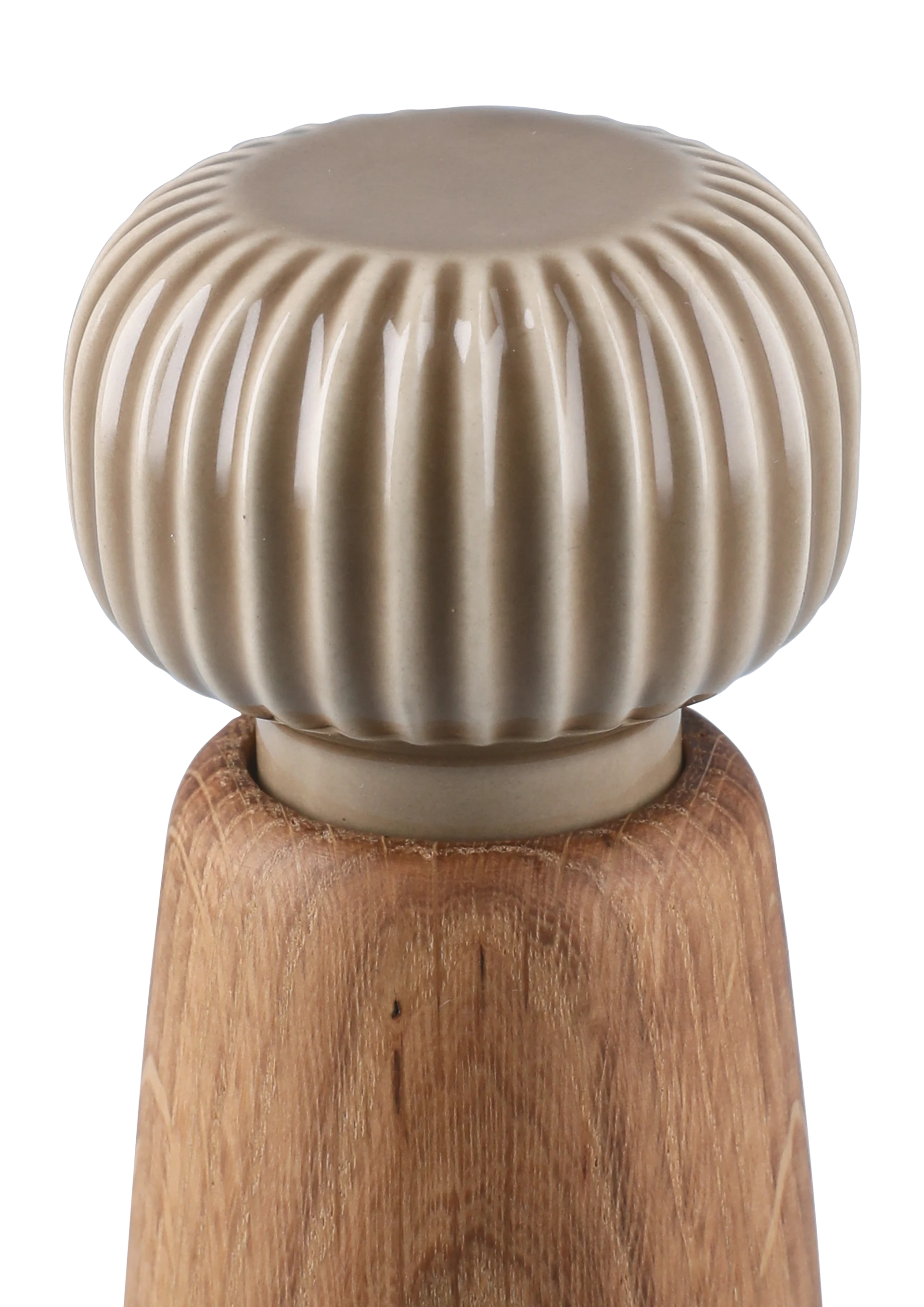 Elegant Hammershøi-kværn i FSC®-certificeret egetræ med keramisk knop i brun nuance og ikoniske riller.
