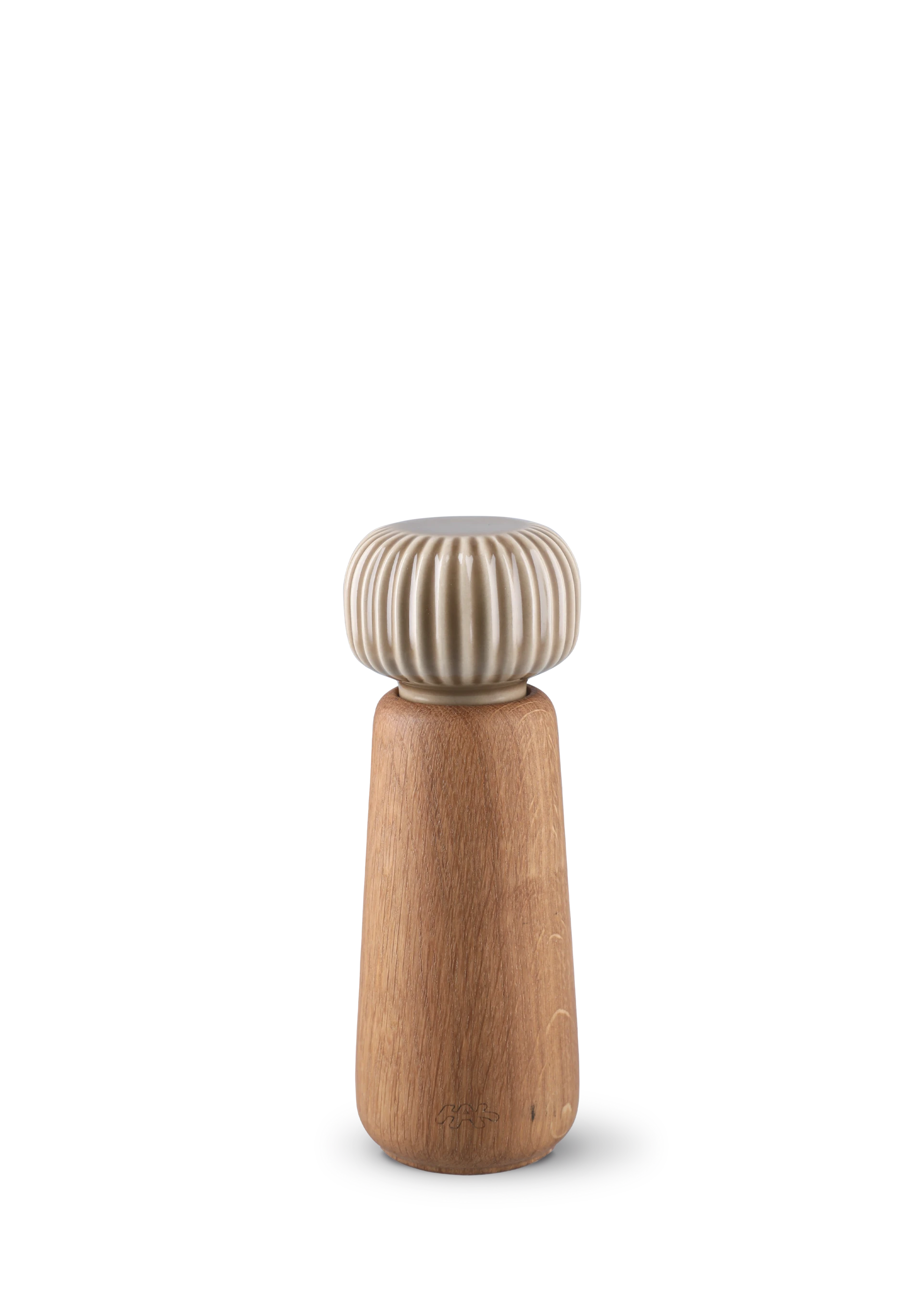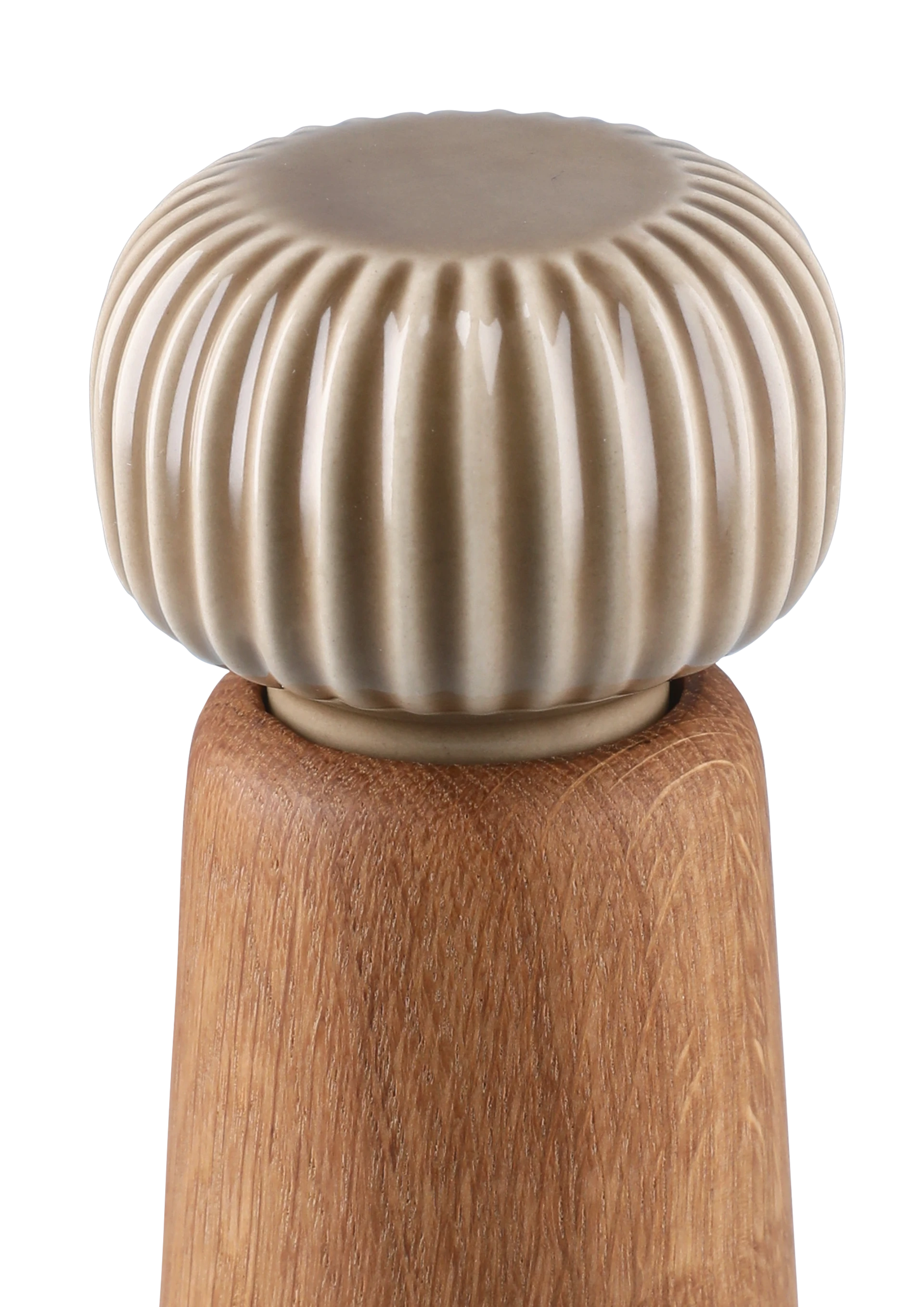 Elegant Hammershøi-kværn i FSC®-certificeret egetræ med keramisk knop i brun nuance og ikoniske riller.