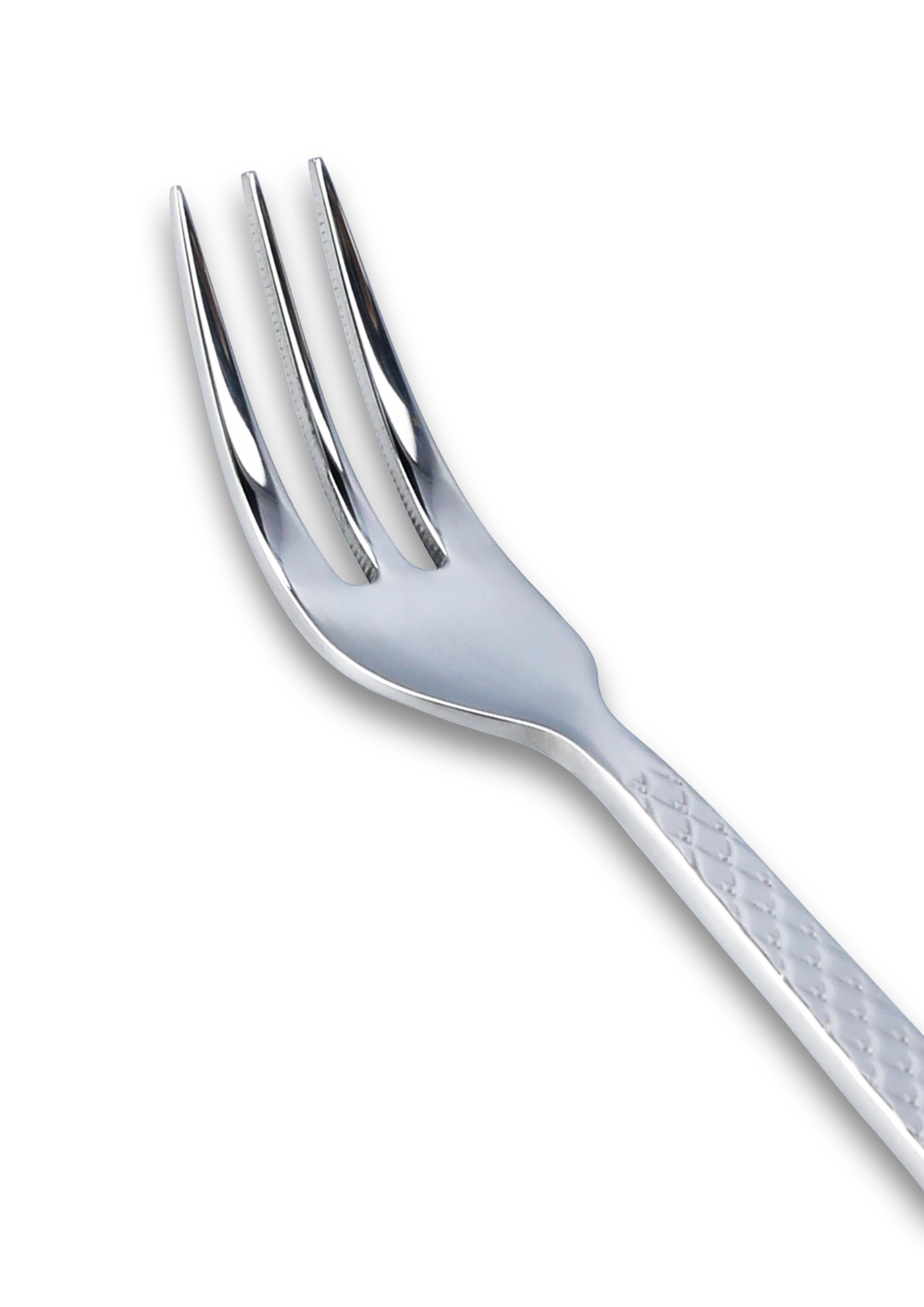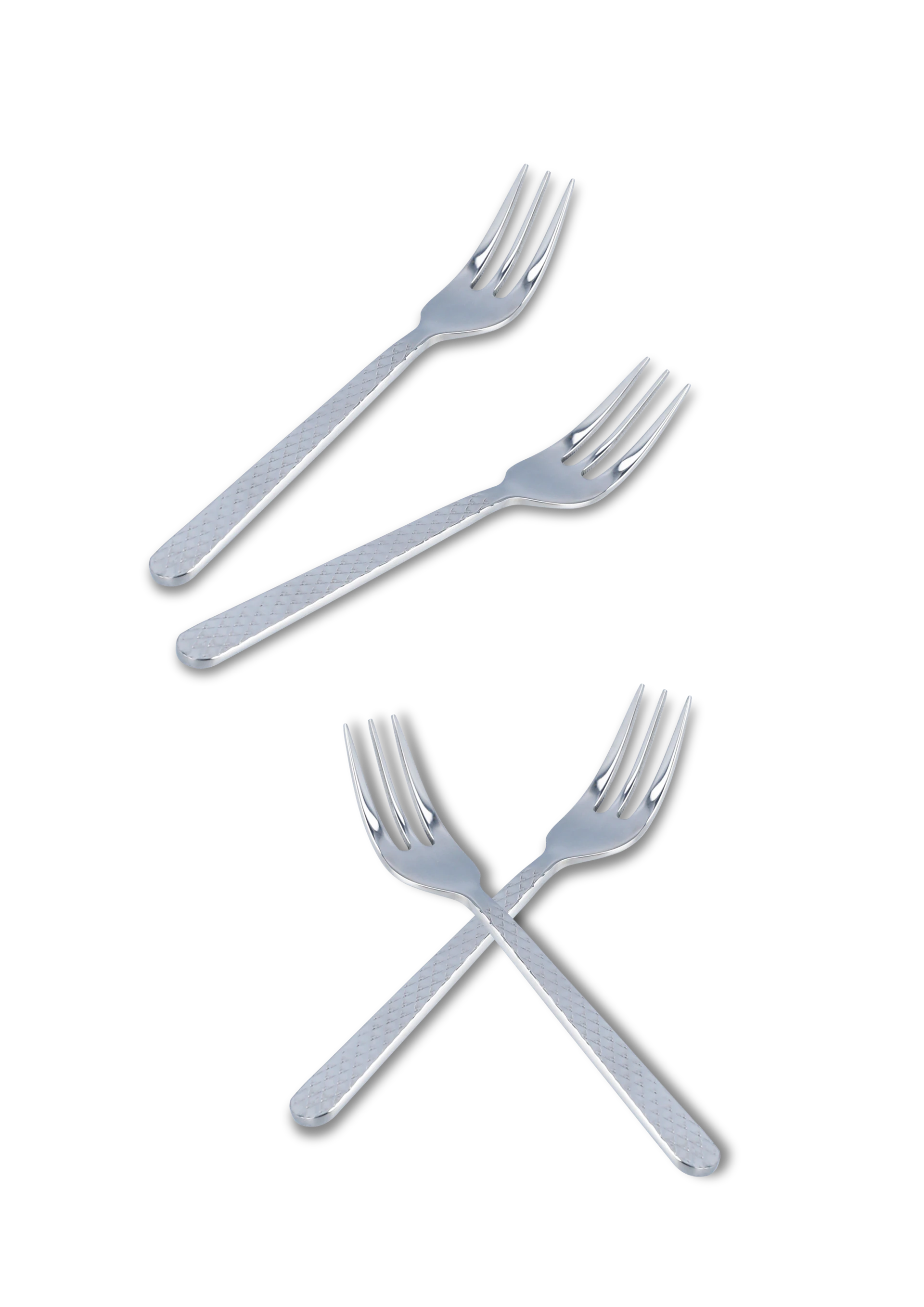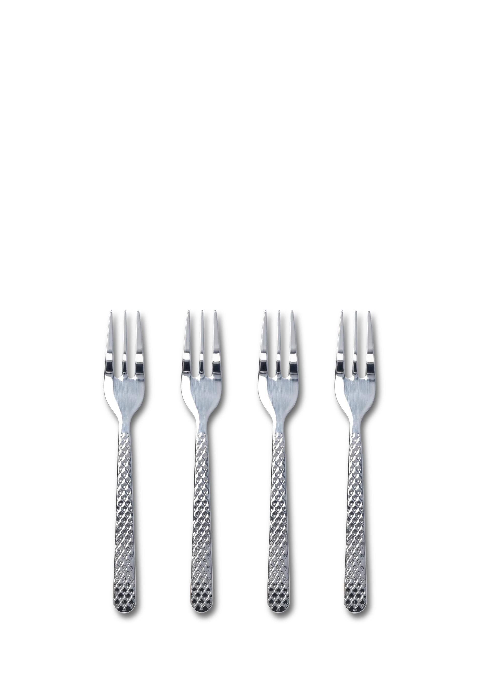 Sæt med 4 Rhombe-kagegafler i 100% genanvendt stål med ikonisk Rhombe-mønster i lavt relief.