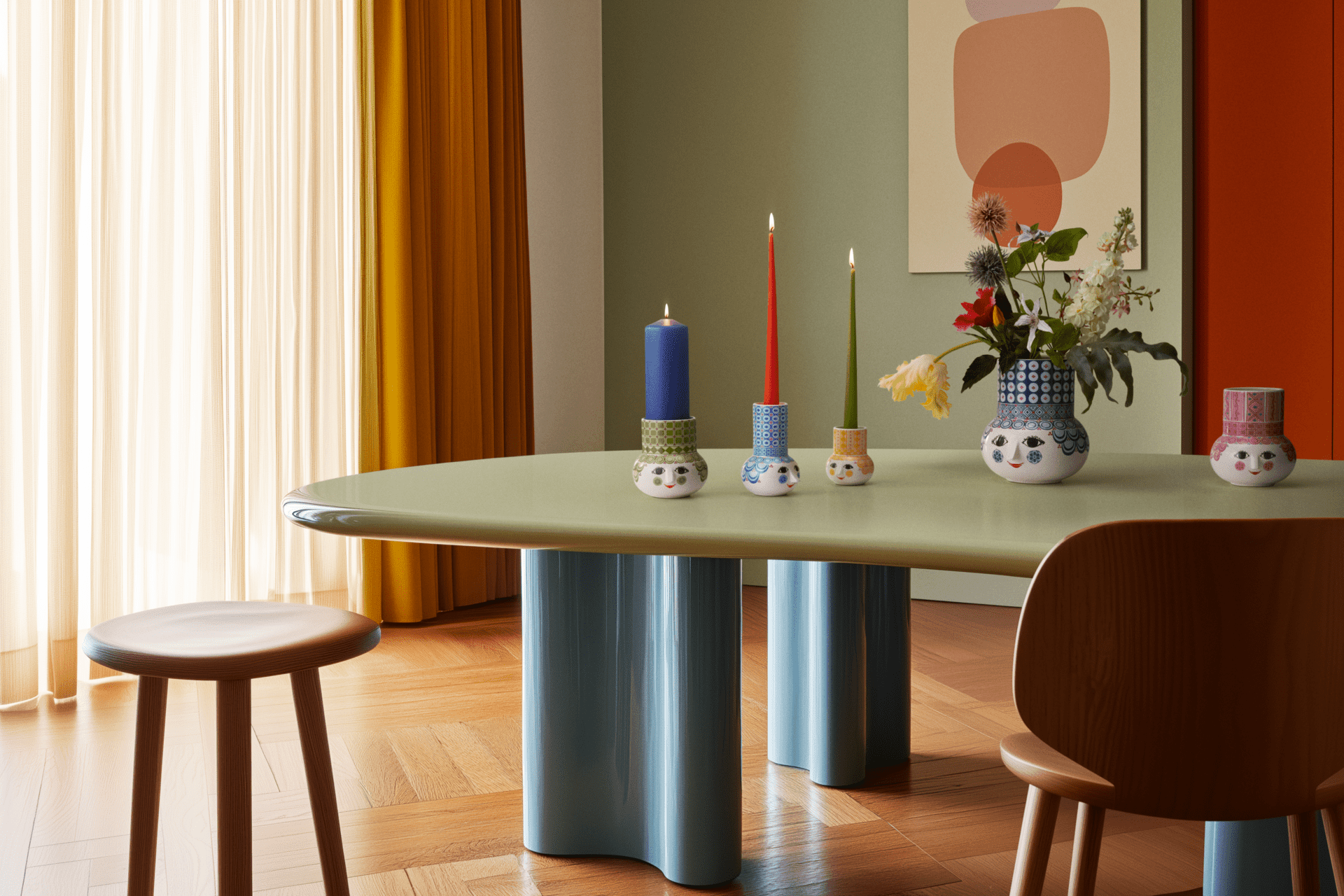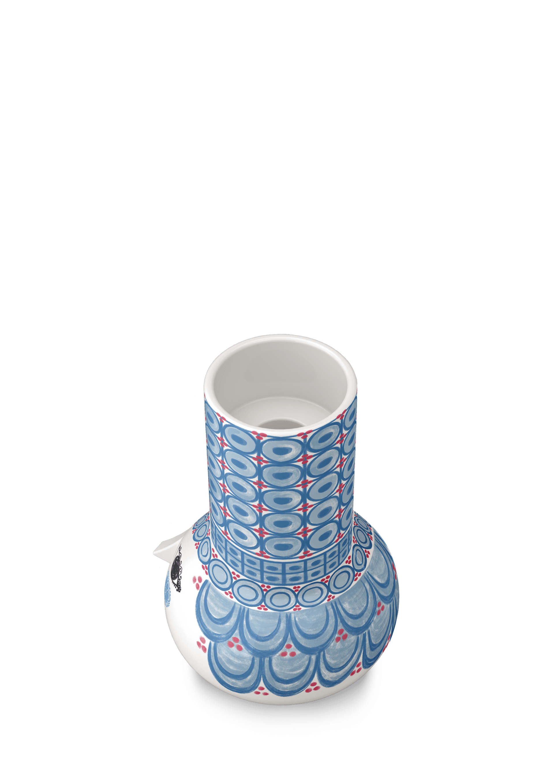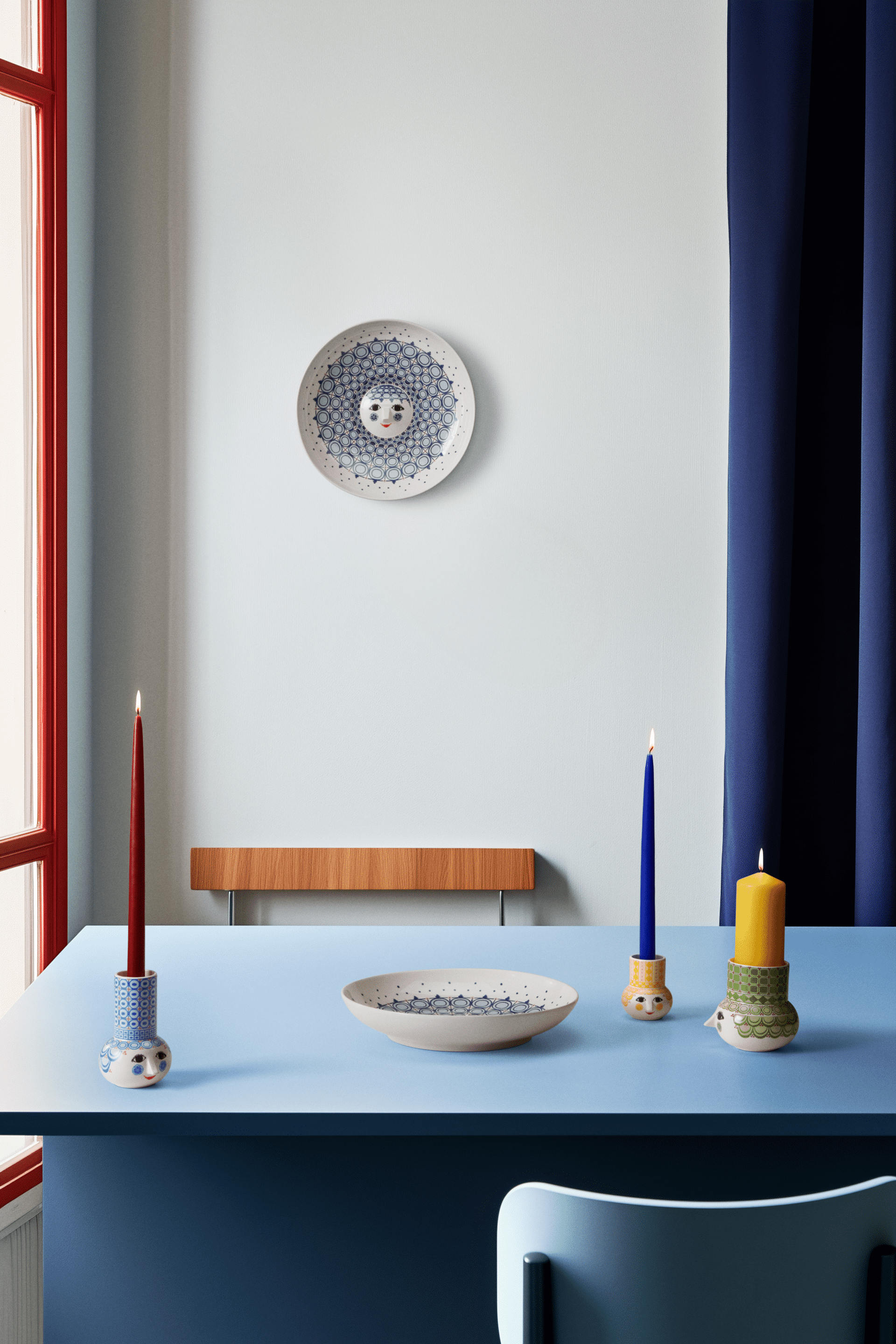 Udfold din farverige personlighed og skab plads til glæde med Bjørn Wiinblads Olga. Med sit søde smil, kulørte kinder og karakterfulde dekorationer rummer Olga på alle måder essensen af Bjørn Wiinblad som person og kunstner – også når hun tager form som lysestage. Glad og drømmende skaber hun liv og personlighed i indretningen med sit poetiske udtryk og sine sprudlende farver. Olga-lysestagen har samme runde form og cylindriske top som vaserne i Olga-serien, der så dagens lys i 2024 som en nyfortolkning af en ikonisk vase fra Bjørn Wiinblads imponerende designarkiv. Lysestagen prydes af et sødt rundt ansigt med de mandelformede øjne og den ikoniske trekantede næse, der nok nærmest er selve personificeringen af Bjørn Wiinblads kunst. Den store lysestage i serien til både fyrfadslys og kronelys måler 14 cm i højden, og med en klar lyseblå med endnu mere lyseblå toner i kombination med prikker i lyserød er der også fuld smæk på farverne. Alle Olga-lysestager er lavet af skinnende glaseret keramik med farverige decals, og dekorationerne er en skøn blanding af originale Bjørn Wiinblad-mønstre, der i en skøn varieret farvepalet giver dig et moderne og friskt udtryk. Bjørn Wiinblad var en livsglad kunstner med en stor og farverig personlighed, der gik sine egne veje og ikke var bange for at drømme og tænke stort. Den sjæl mærkes også til fulde i Olga, der hviler i sig selv og inviterer os til at udtrykke vores egen stil og personlighed i indretningen med udtryksfulde dekorationer skabt med inspiration i Bjørn Wiinblads originale kunstværker. En ting er sikkert: Det bliver ikke kedeligt, når Olga flytter ind.